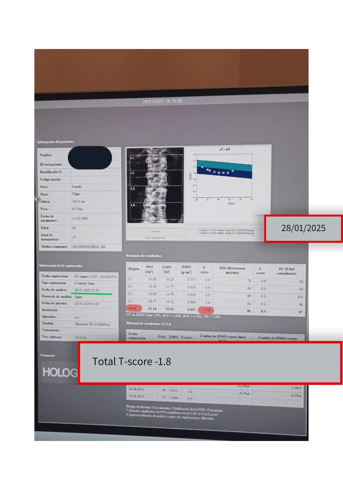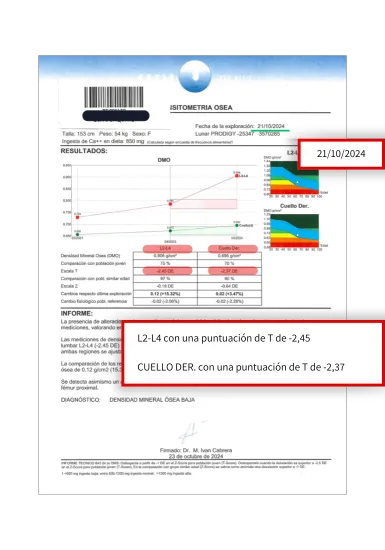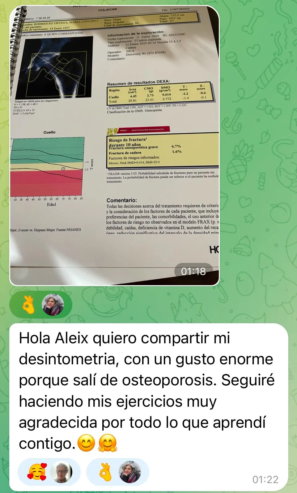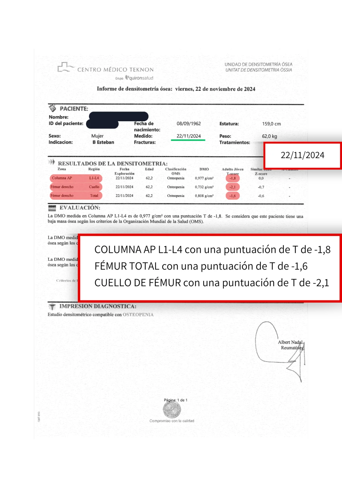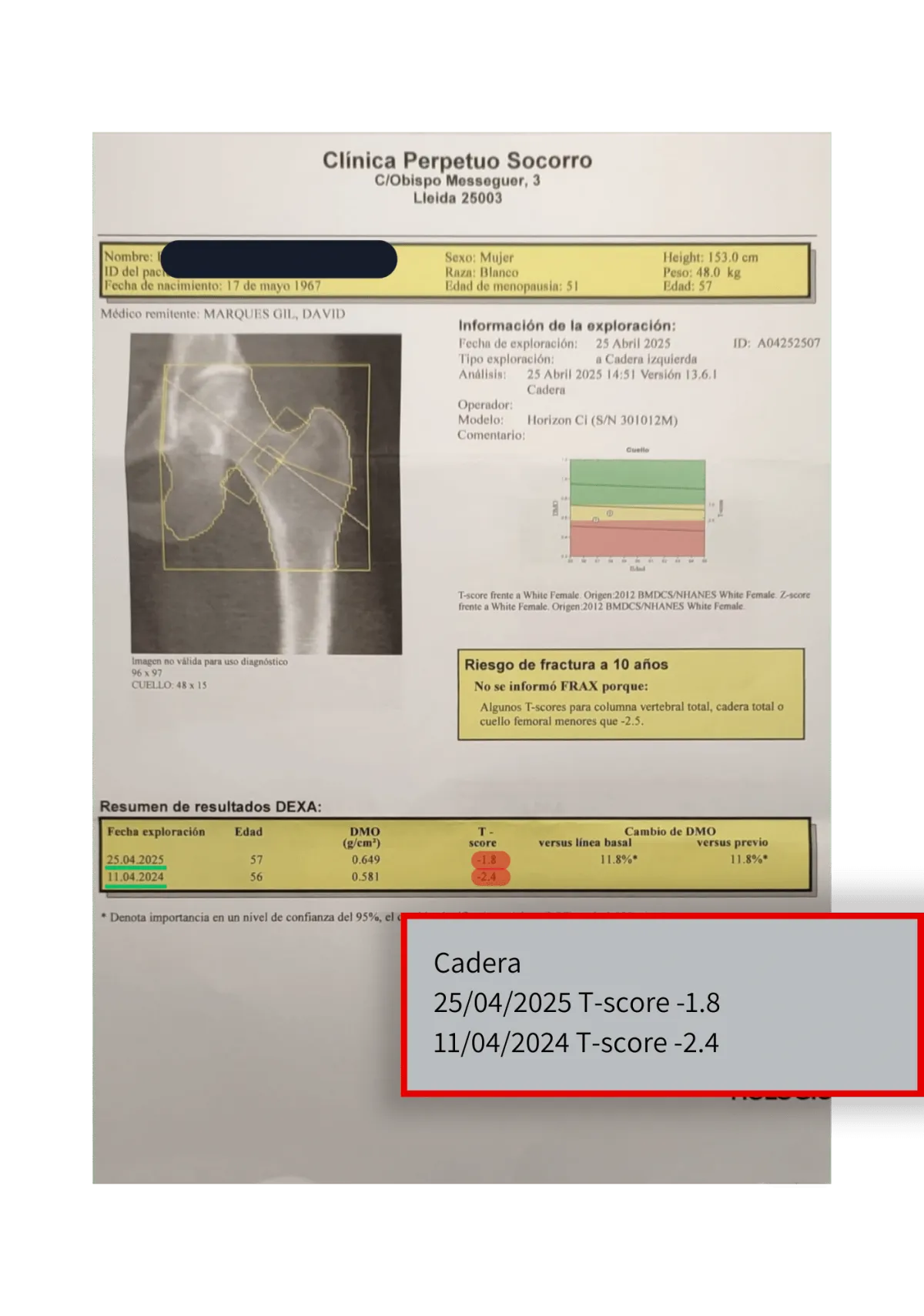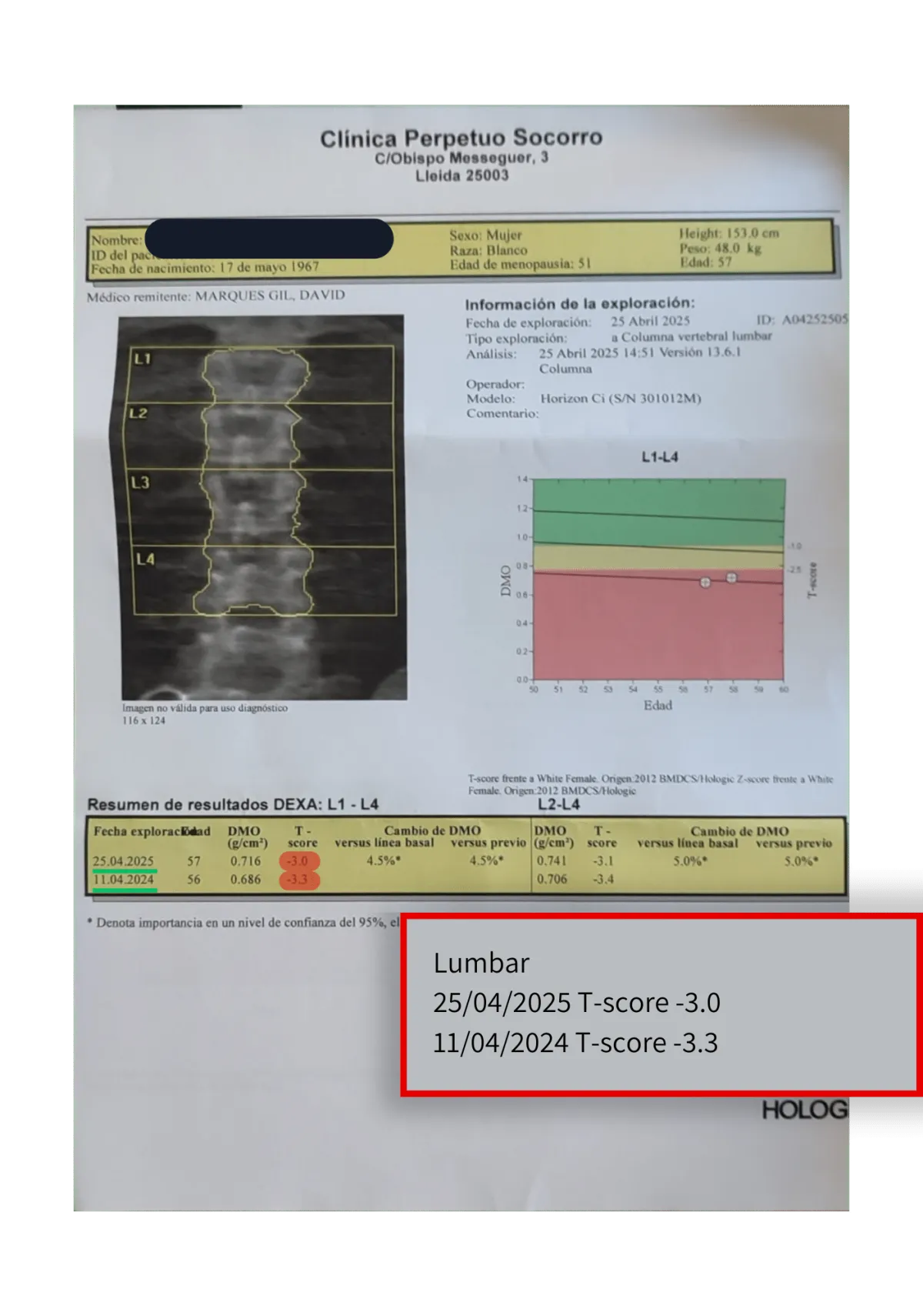 En 2023 tenía -2.8 en lumbares y no empezó el programa hasta finales de 2024. La siguiente densitometría conseguimos frenar y mejorarla a -2.7.
