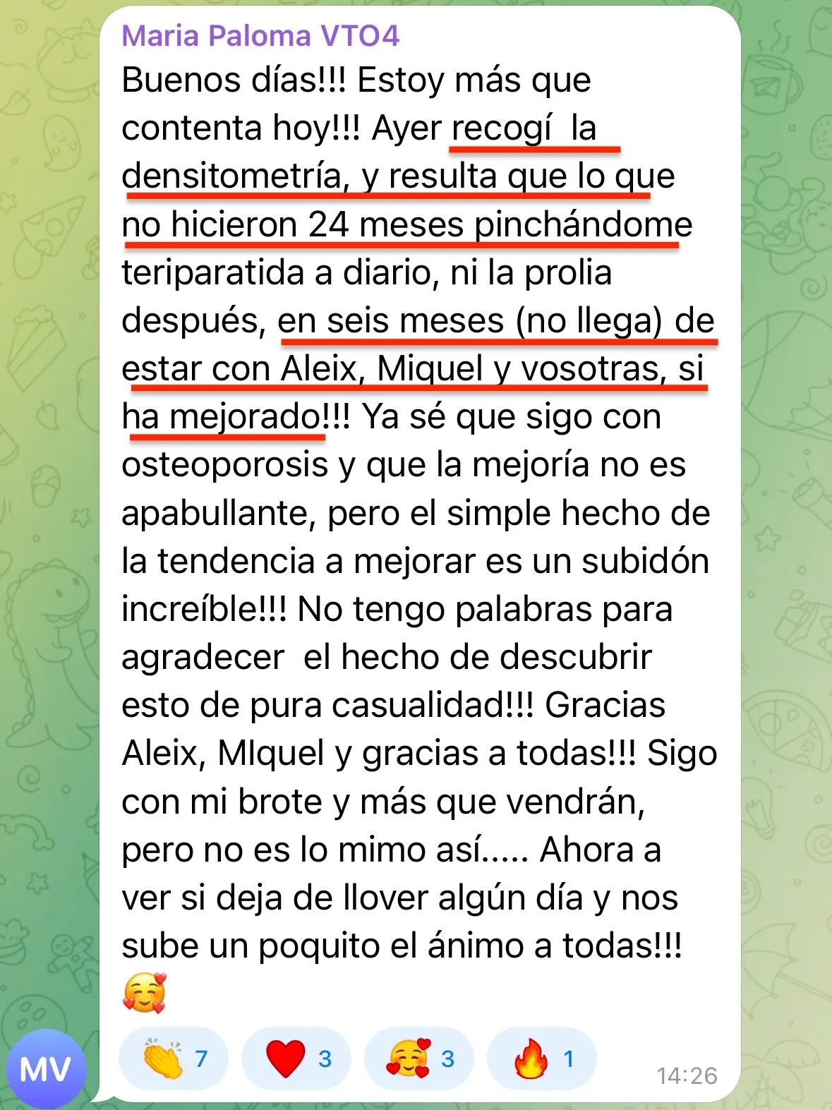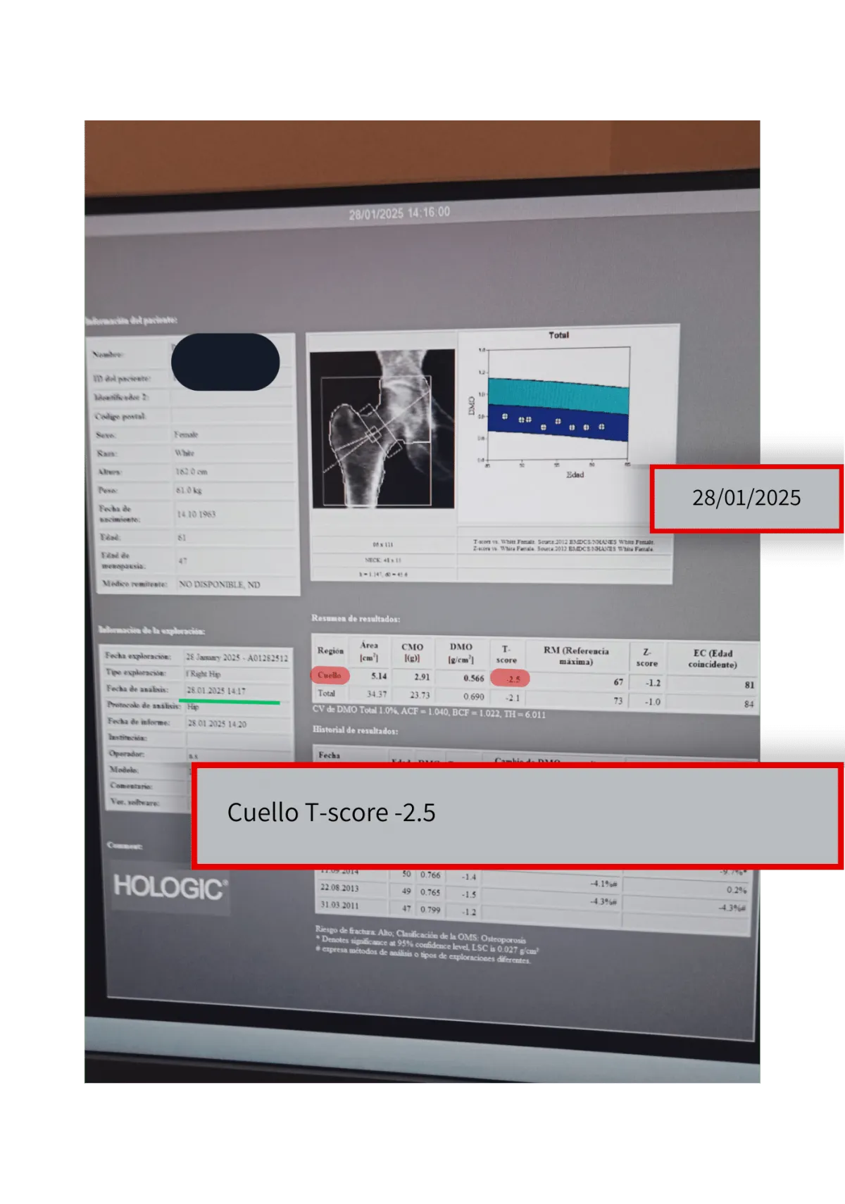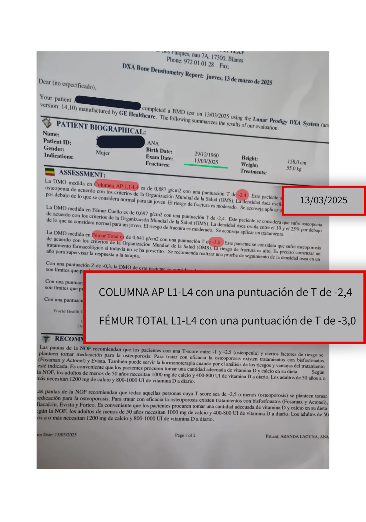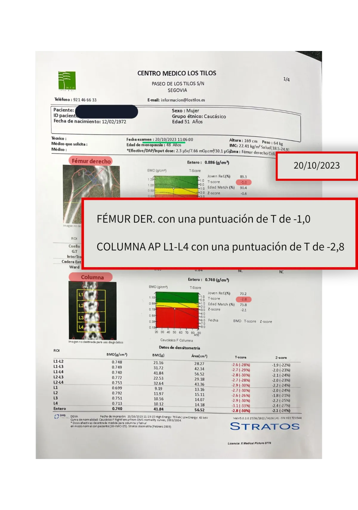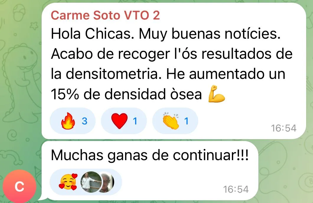 En 2023 tenía -2.8 en lumbares y no empezó el programa hasta finales de 2024. La siguiente densitometría conseguimos frenar y mejorarla a -2.7.