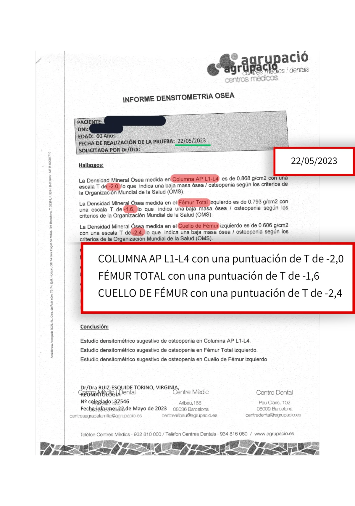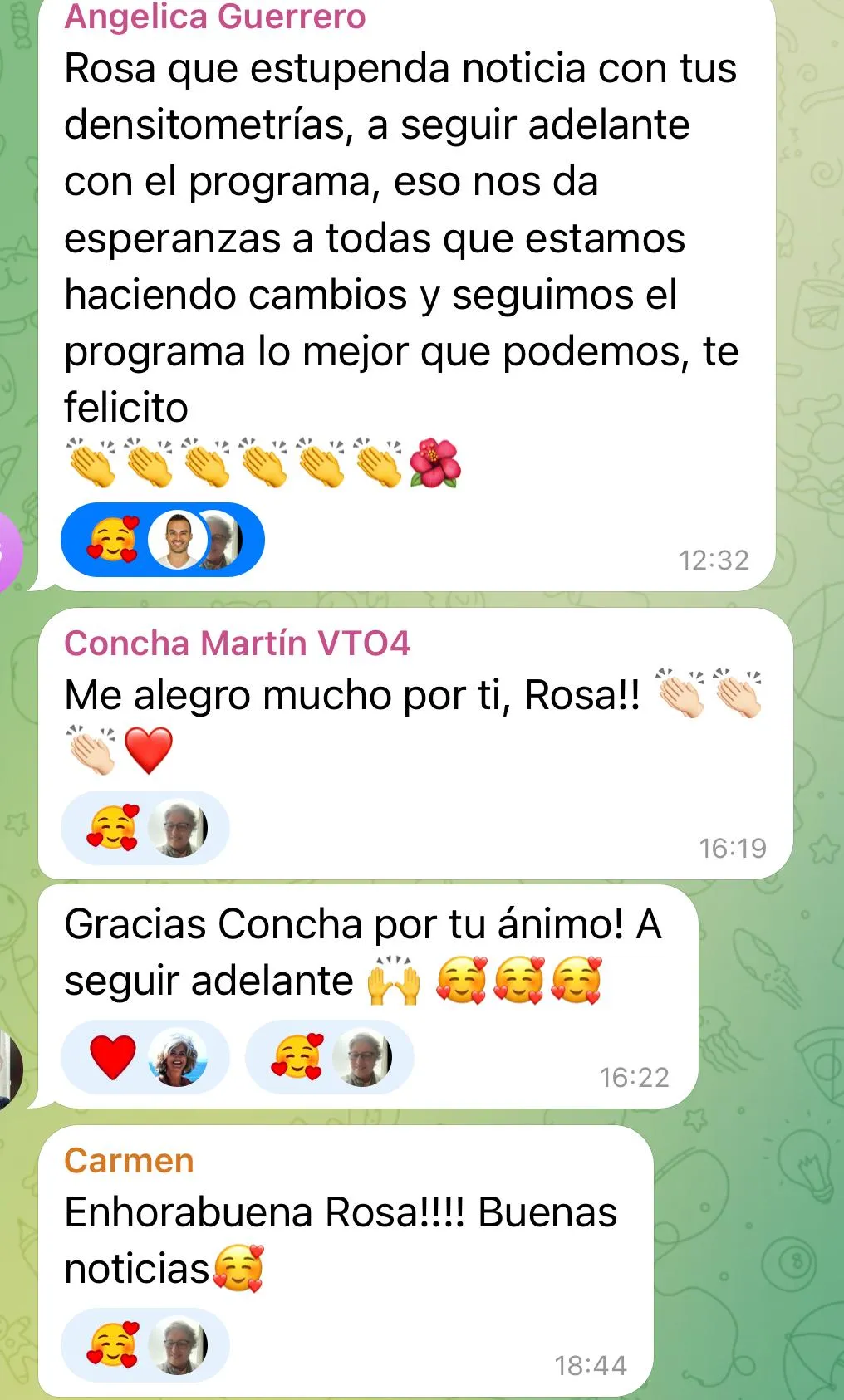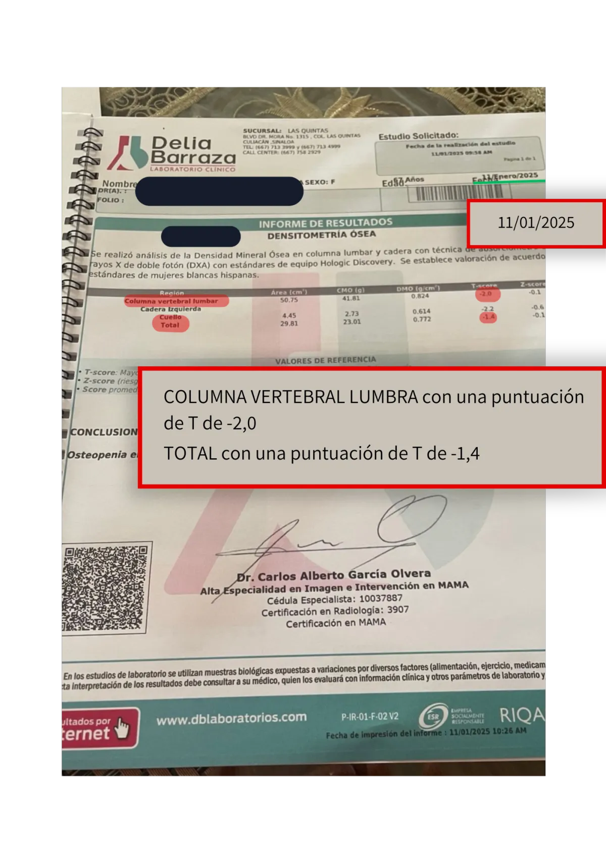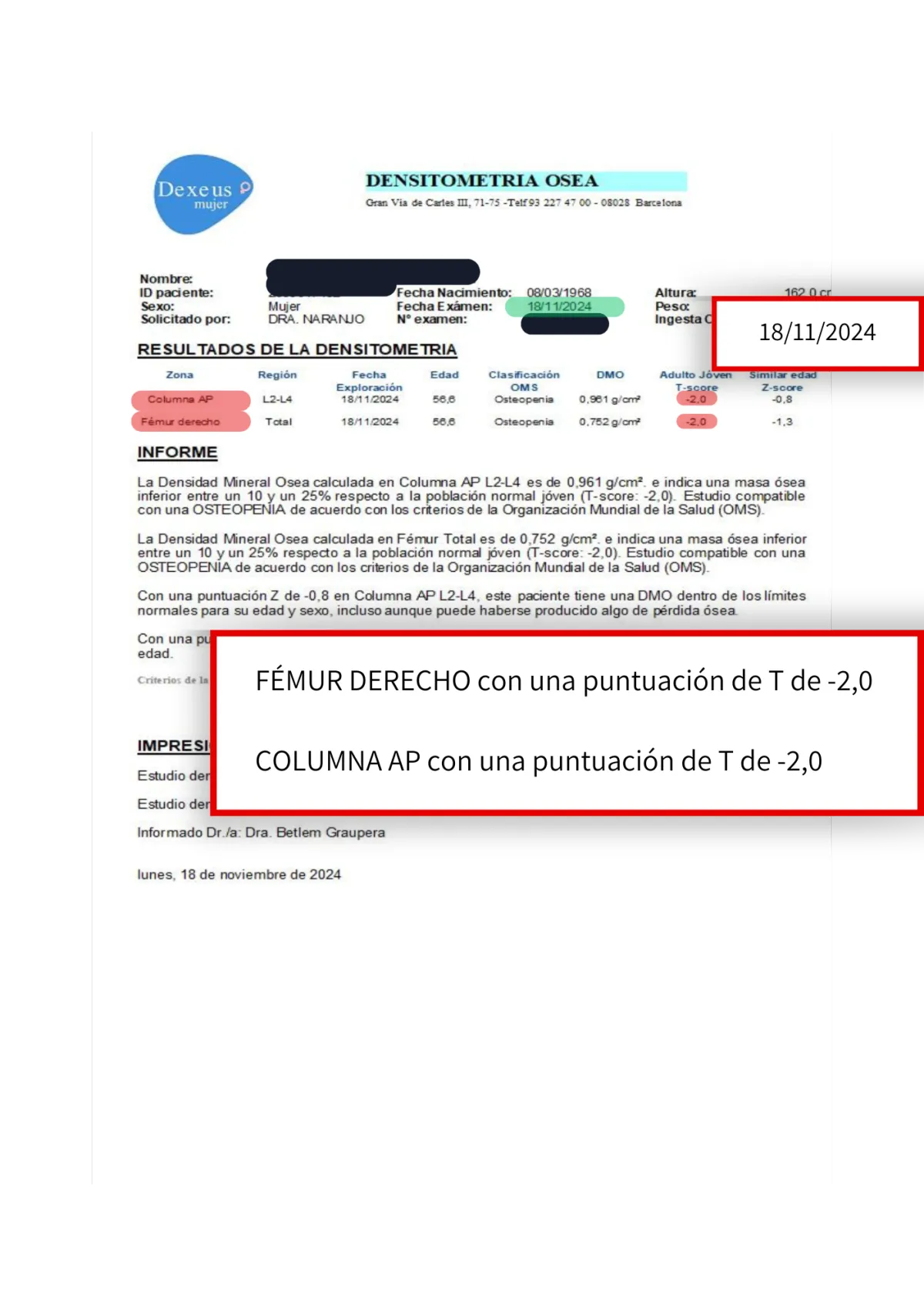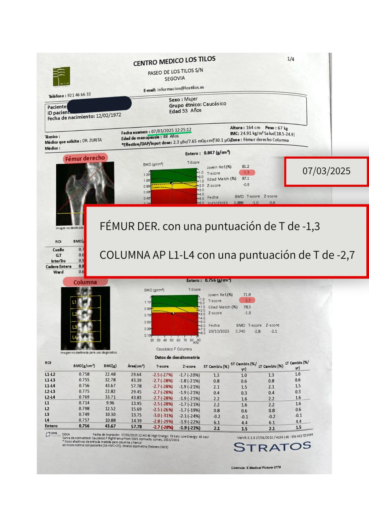 En 2023 tenía -2.8 en lumbares y no empezó el programa hasta finales de 2024. La siguiente densitometría conseguimos frenar y mejorarla a -2.7.