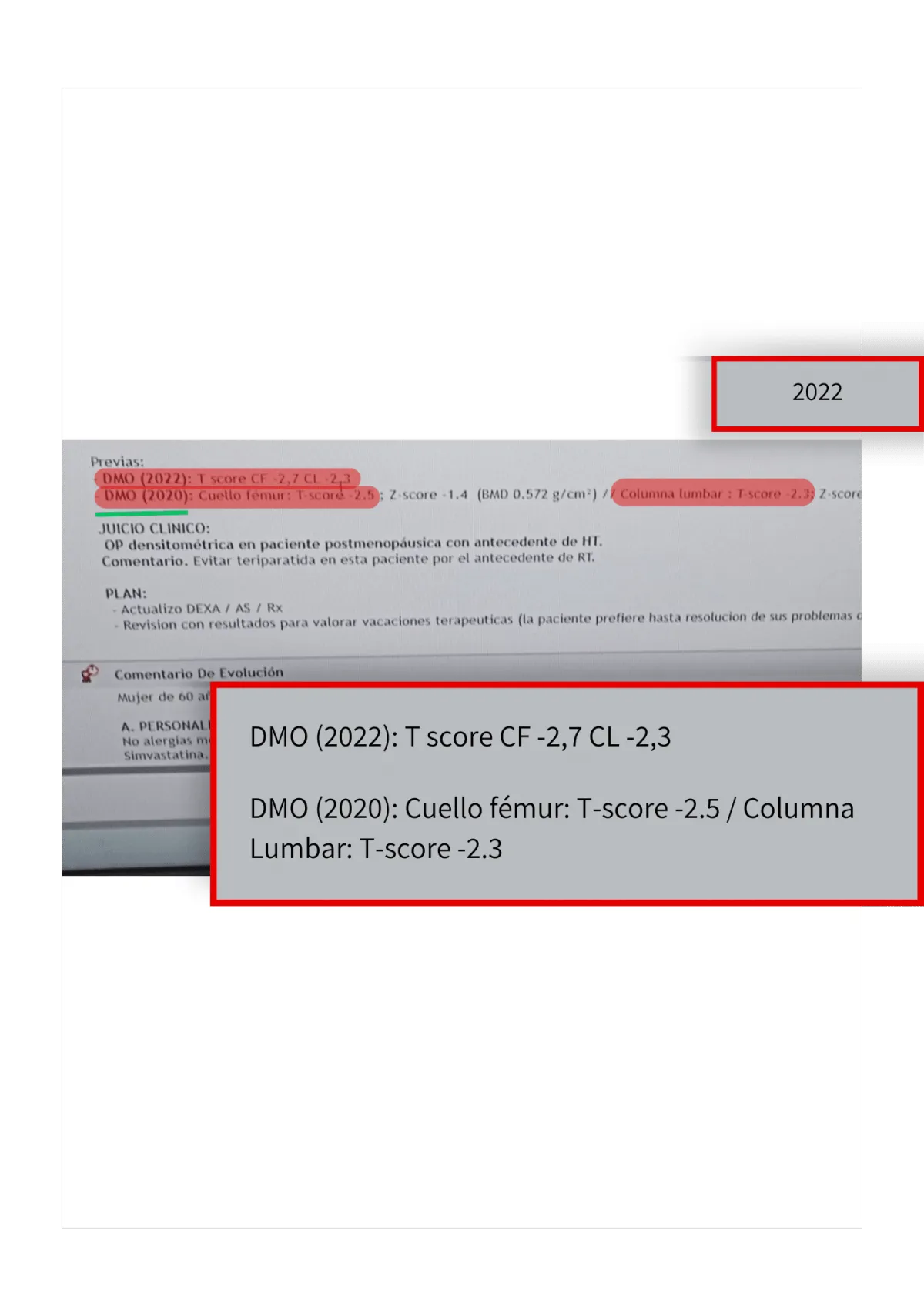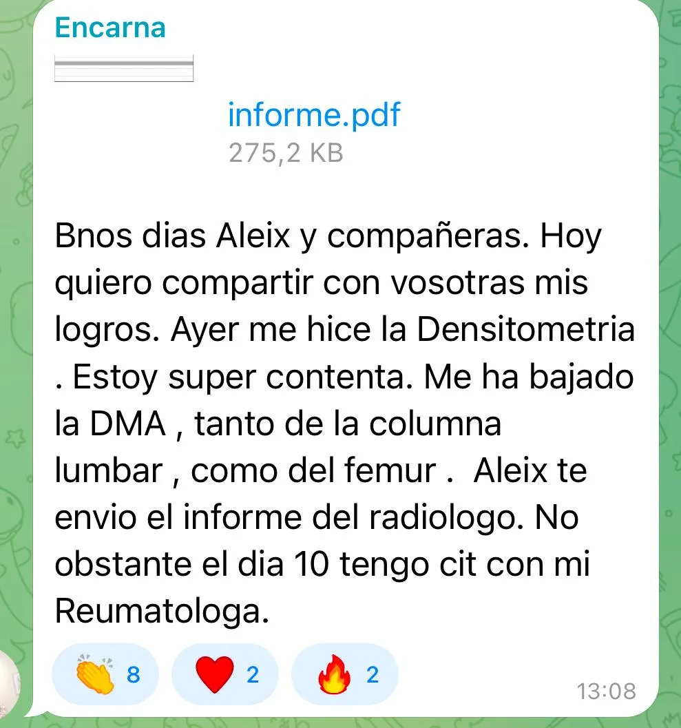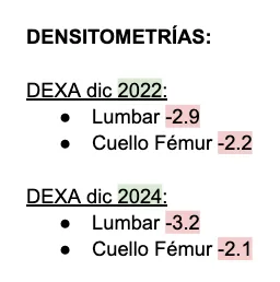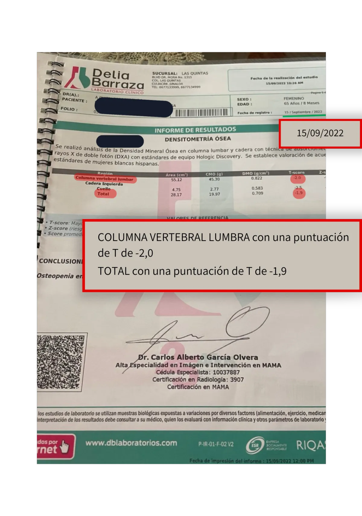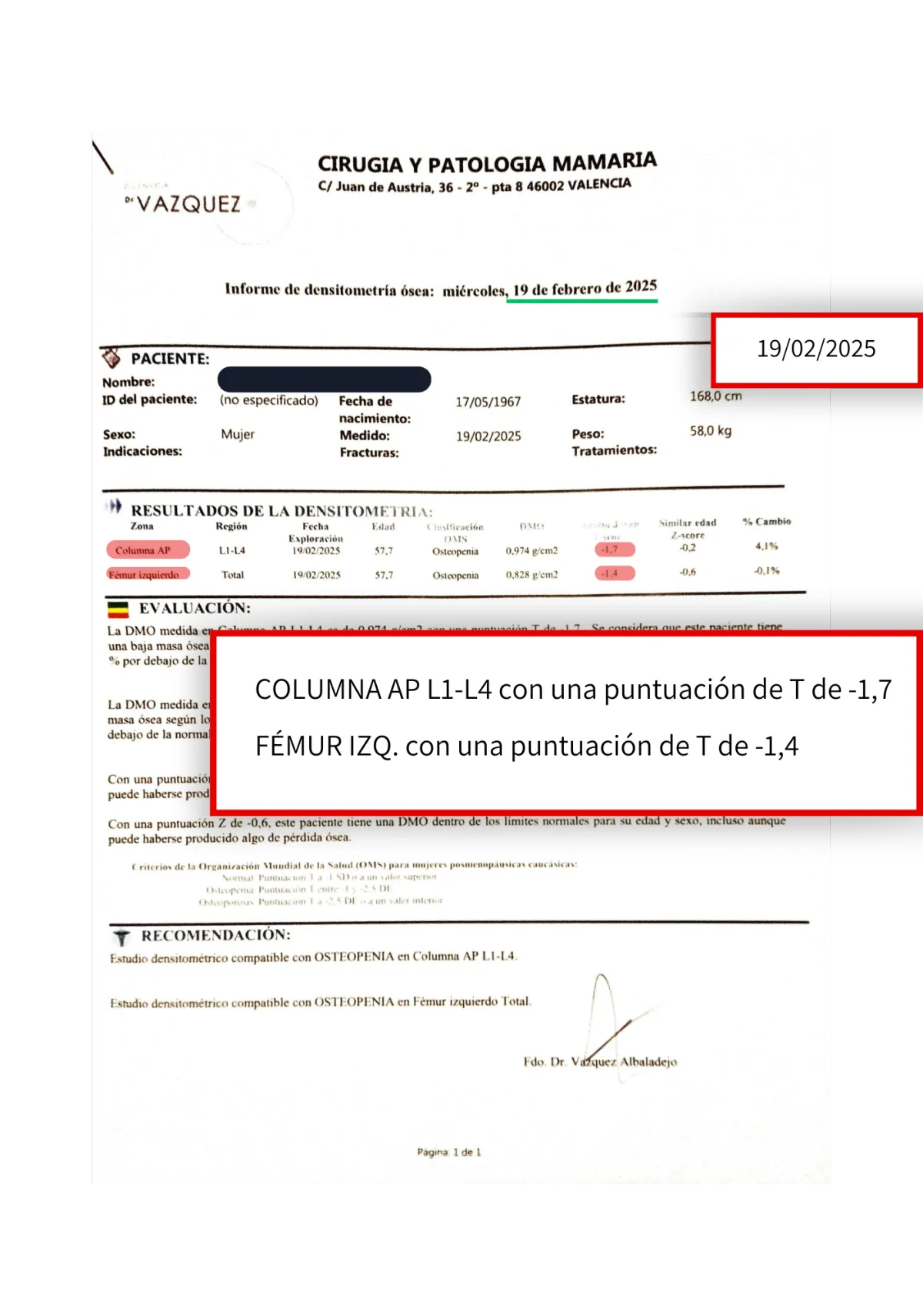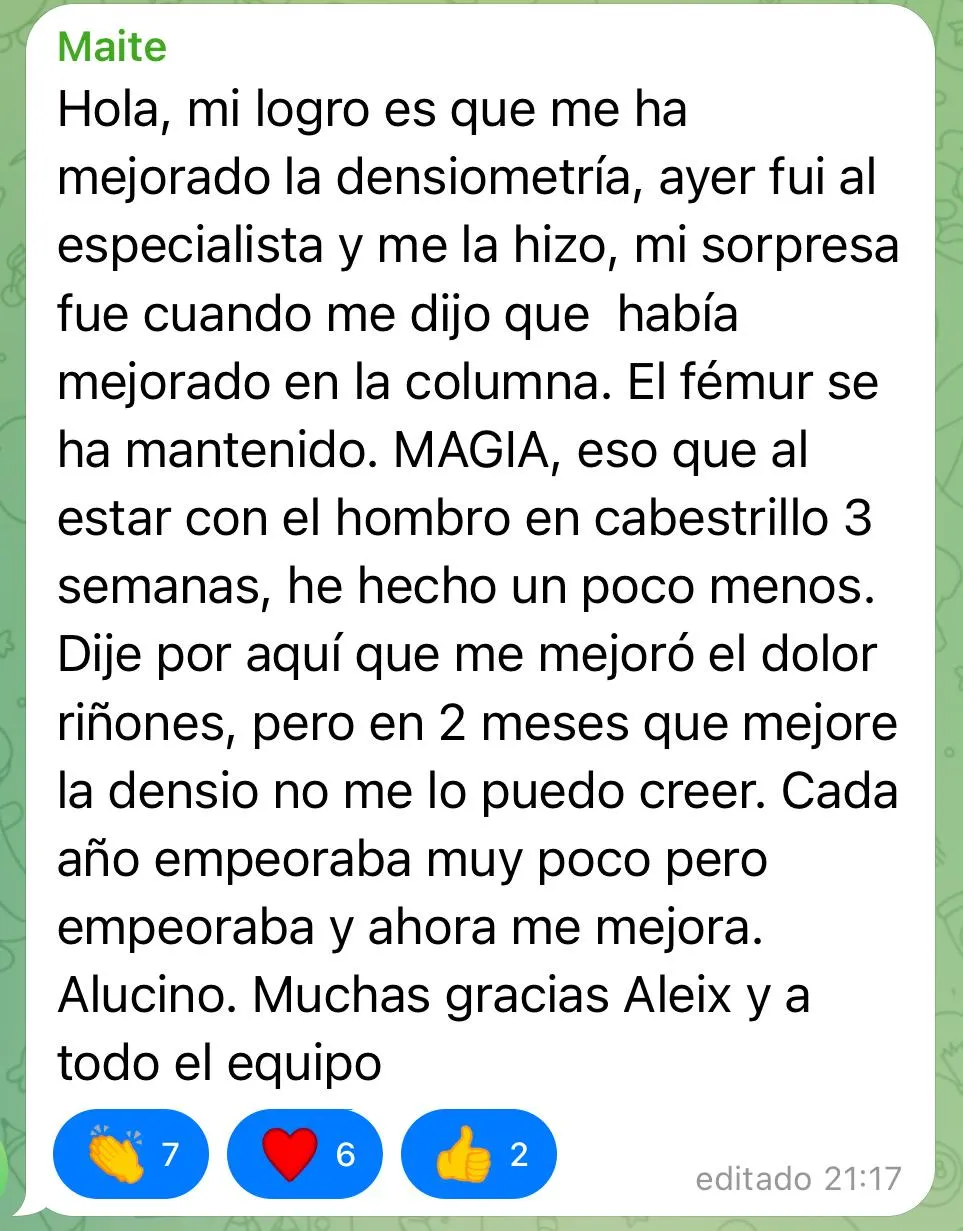 En 2023 tenía -2.8 en lumbares y no empezó el programa hasta finales de 2024. La siguiente densitometría conseguimos frenar y mejorarla a -2.7.