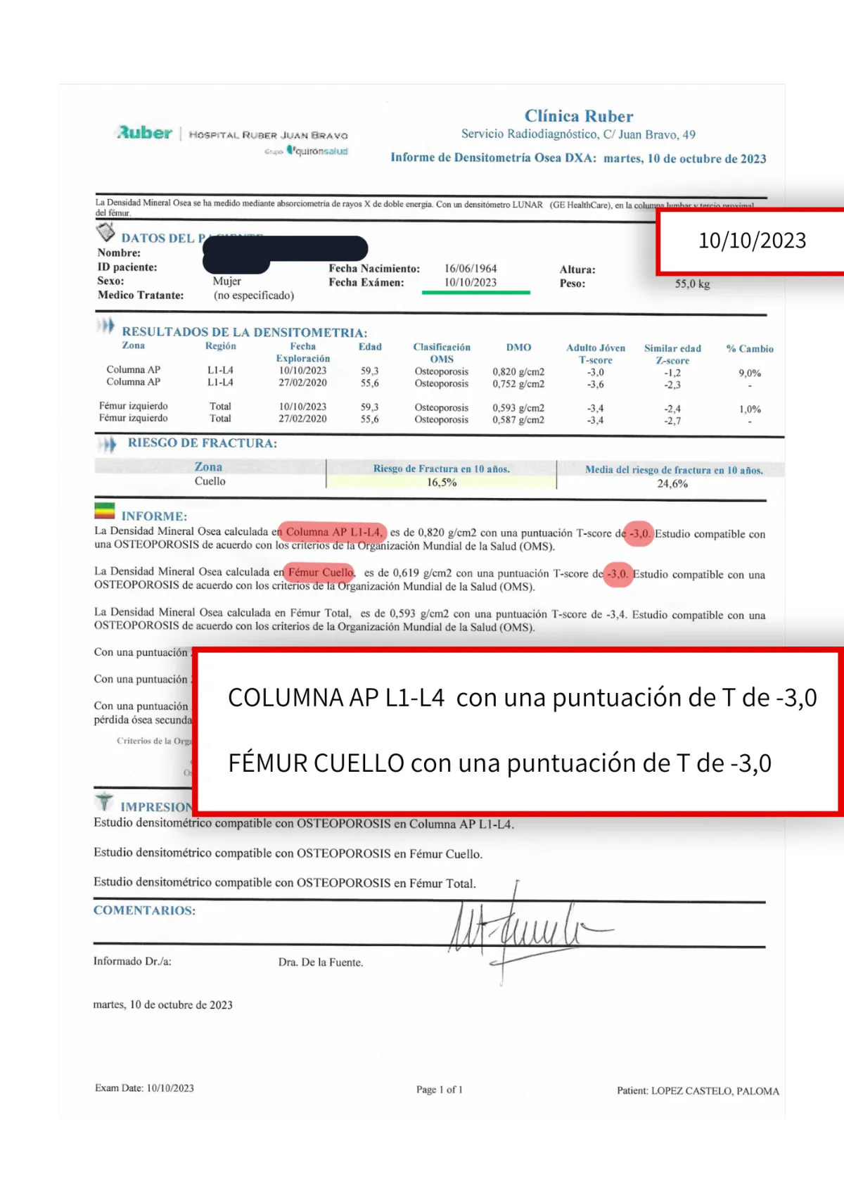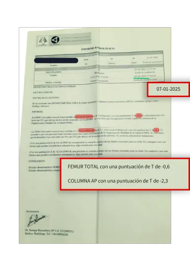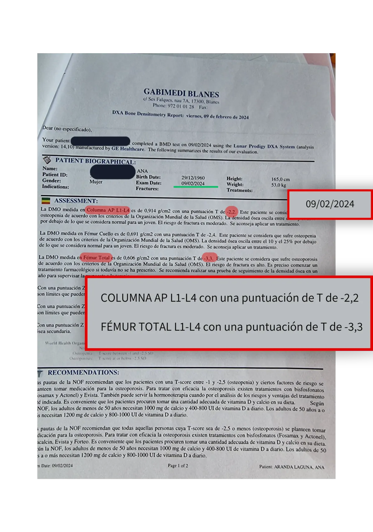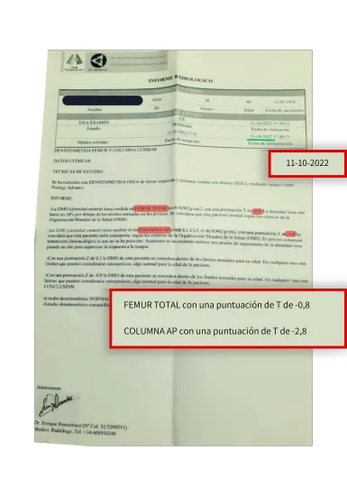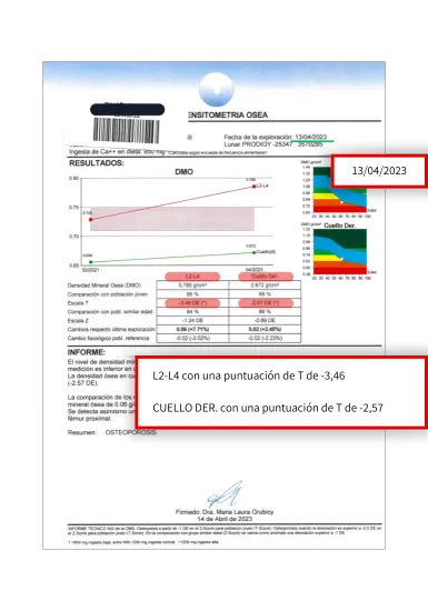 En este caso, durante 1 año y medio la osteoporosis siguió avanzando. Y en solo 3 meses la conseguimos frenar en lumbar y mejorar la cadera.